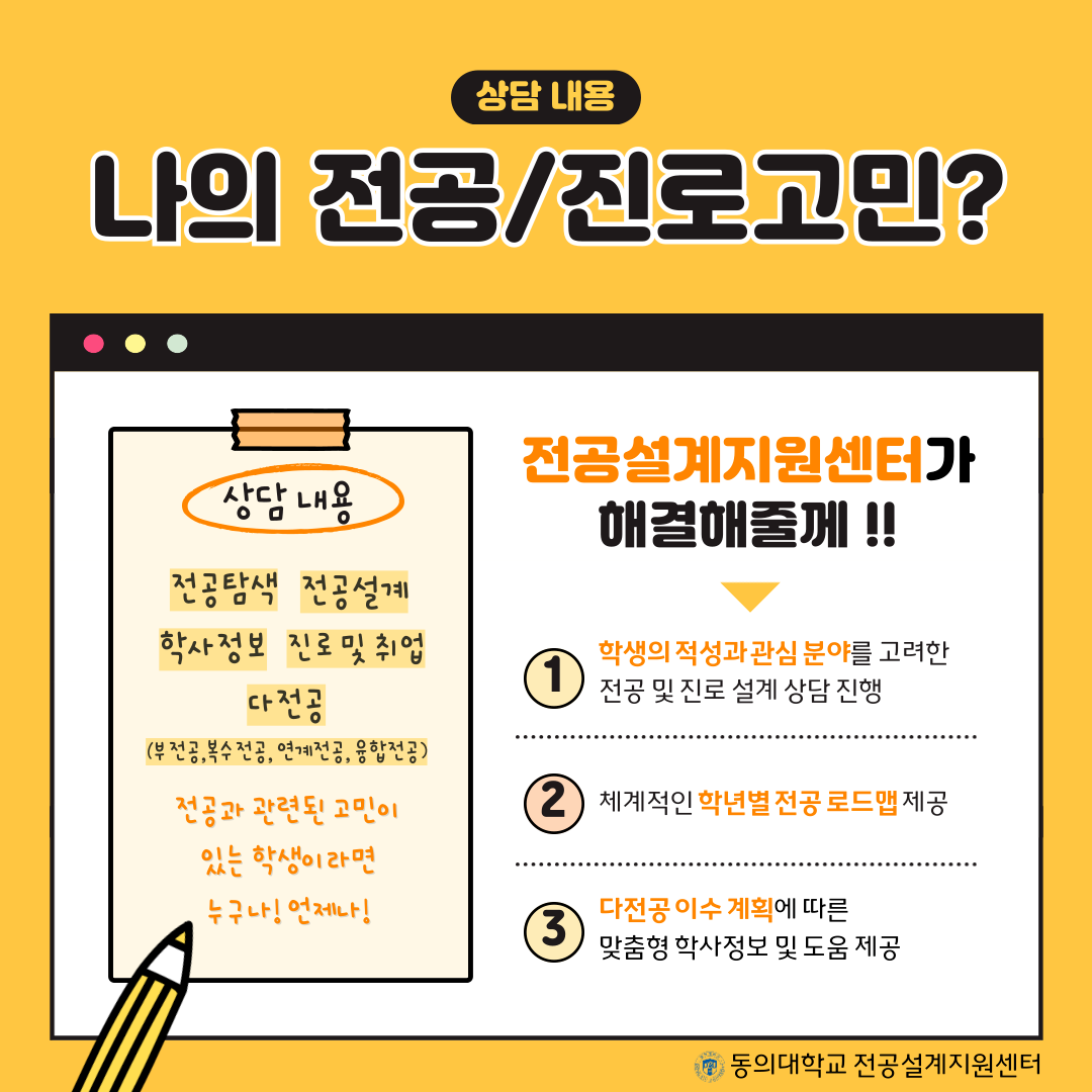 1. 학생들이 전공 설계와 진로 탐색에 필요한 상담을 원활히 신청하고 지원받을 수 있도록, 부서에서는 다음과 같이 안내 및 홍보에 협조해 주시길 바랍니다.