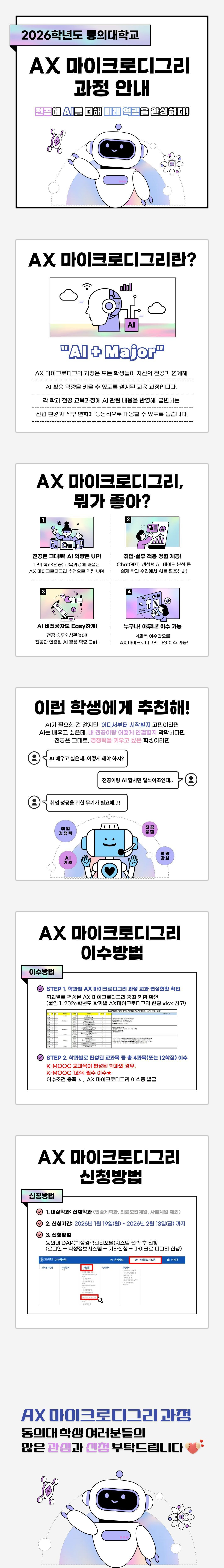 우리 대학은 급변하는 산업 환경과 직무 변화에 능동적으로 대응할 수 있는 미래 인재 양성을 위해, 전공 교육과정에 AI 역량을 결합한 'AX 마이크로디그리'과정을 개발했습니다. 이에 학과(전공) 재학생들은 본 과정을 원활히 신청하고 이수할 수 있도록 참고 부탁드립니다.