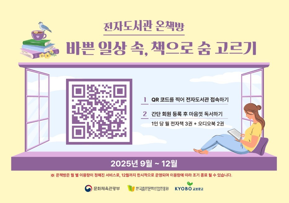 문화체육관광부와 한국출판문화산업진흥원이 교보문고와 함께 독서의 달을 맞이하여, 일상속에서 독서를 더욱 가까이 즐길 수 있도록 대국민 전자책 열람 서비스인 '온책방' 서비스를 운영하고 있으니 많은 관심과 이용 부탁드립니다.